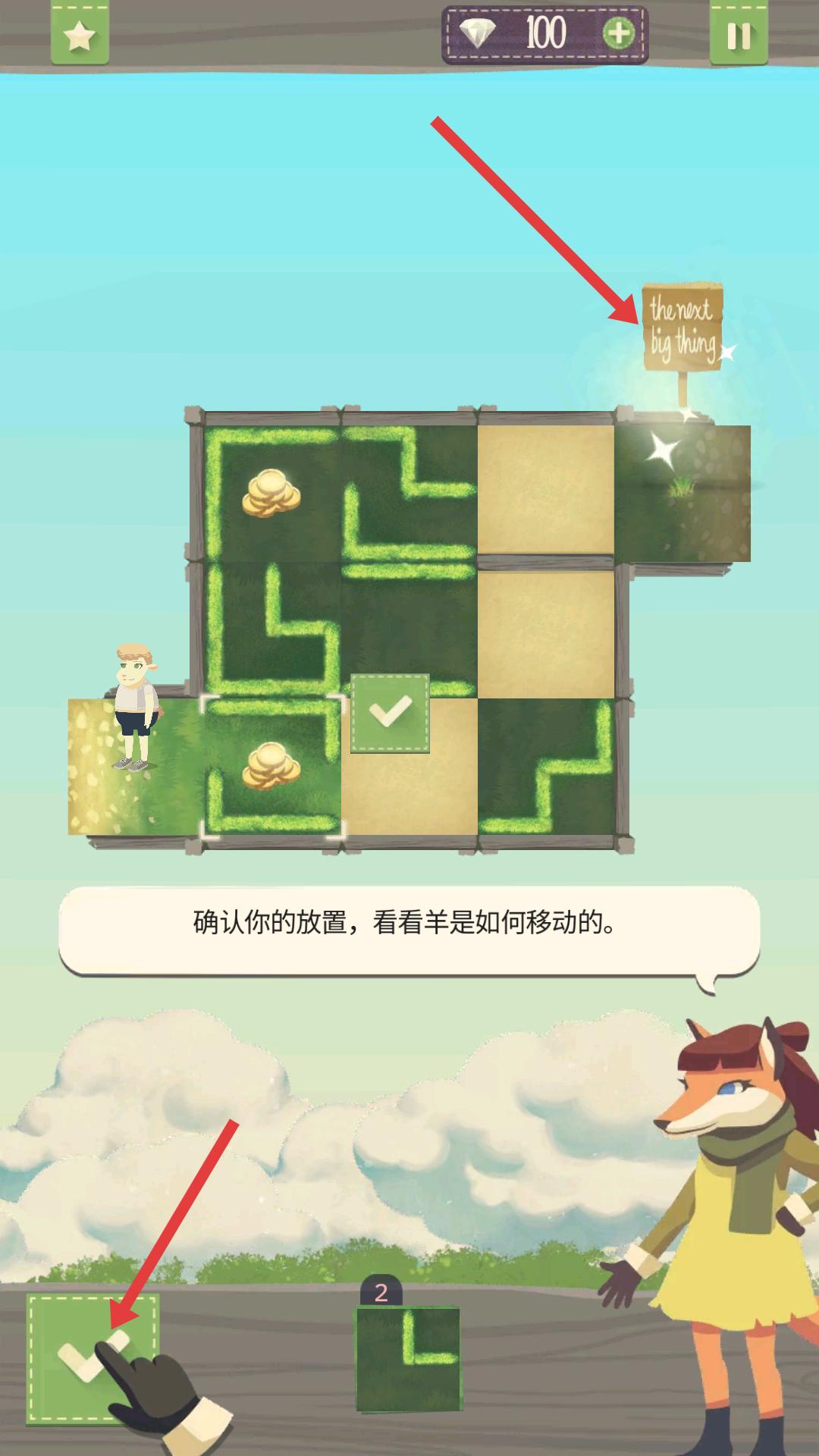 3、放置好瓷磚后,點擊確認按鈕,觀察羊的移動軌跡,看是否能順利到達目標位置,以此驗證瓷磚放置是否正確。