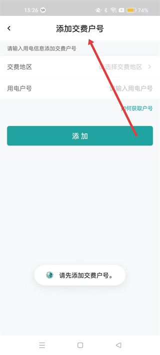 2、添加交費戶號界面,需選擇交費地區并輸入用電戶號,點擊添加即可完成交費戶號添加,方便后續電費繳納等操作。