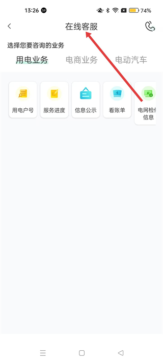 4、進入在線客服界面,可選擇用電業務、電商業務、電動汽車等咨詢板塊,還有用戶戶號、服務進度等功能入口,方便用戶咨詢電力相關問題。