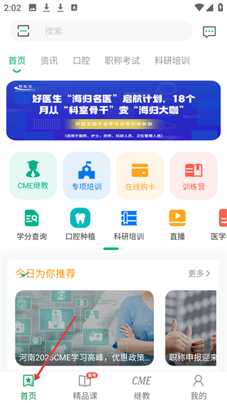 1、首頁有CME繼教、專項培訓等功能,還推出海歸名醫啟航計劃,助力醫護等人員海外訪學,另有今日推薦內容。