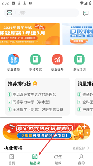 2、精品課頁面,有2026年醫學考試題庫優惠,還有執業資格、職稱考試等板塊,推薦排行榜展示熱門課程。
