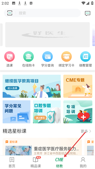 3、繼教板塊有選課、在線購卡等功能,涵蓋繼續醫學教育項目、CME專題等,還有精選星標課。