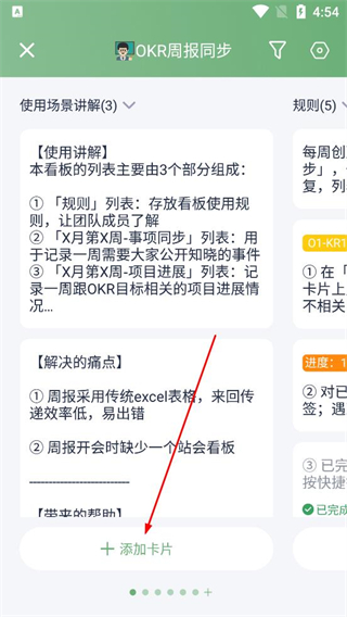 4、熟悉操作后找到添加卡片按鈕,點擊該按鈕可添加新的卡片內容,完善OKR周報相關的信息記錄。