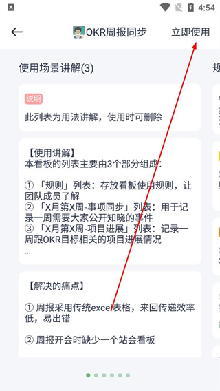 2、在OKR周報同步詳情頁查看使用場景講解,了解看板組成及解決的痛點,點擊立即使用按鈕進入看板操作界面。