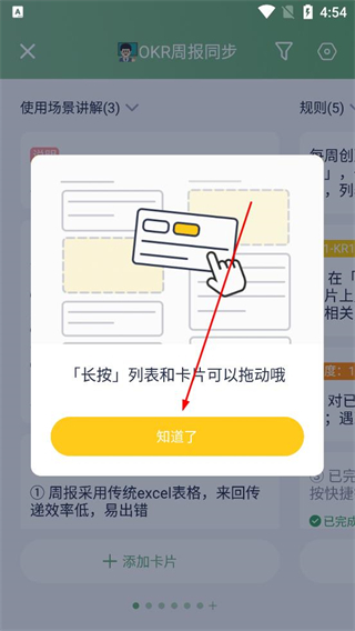3、進入界面后彈出長按拖動的提示彈窗,點擊知道了關閉彈窗,熟悉看板中列表和卡片的拖動操作方式。