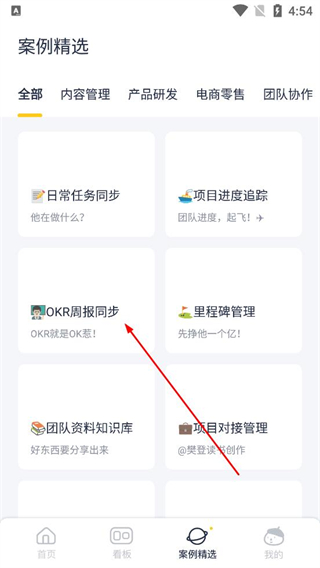 1、打開板栗看板軟件進入案例精選頁面,在展示的案例中選擇OKR周報同步選項,點擊進入該案例的詳情頁面。