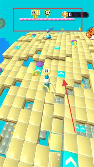 3、持續操控萌寵移動,觀察上方的進度條和時間等提示,根據跑道上的箭頭等指引,調整萌寵的移動方向,向終點前進。