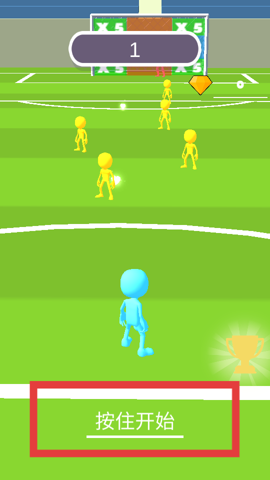 1、玩家下載游戲之后,在游戲界面找到按住開始區域并按住,使角色進入踢球準備狀態,開啟踢球流程。