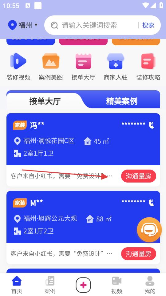 1、大魚裝修平臺APP,進入首頁在接單大廳瀏覽訂單信息,如福州瀾悅花園C區等家裝需求,點擊溝通量房,可聯系客戶洽談裝修業務。