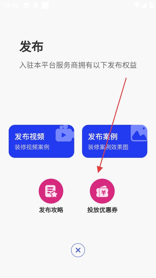 2、進入發布頁面,選擇投放優惠券選項,按提示設置優惠內容、使用規則,發布優惠券吸引客戶。