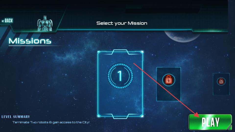 2、返回主界面,進入任務選擇頁,選擇Mission1,查看任務目標為消滅兩個機器人,點擊PLAY開始任務。