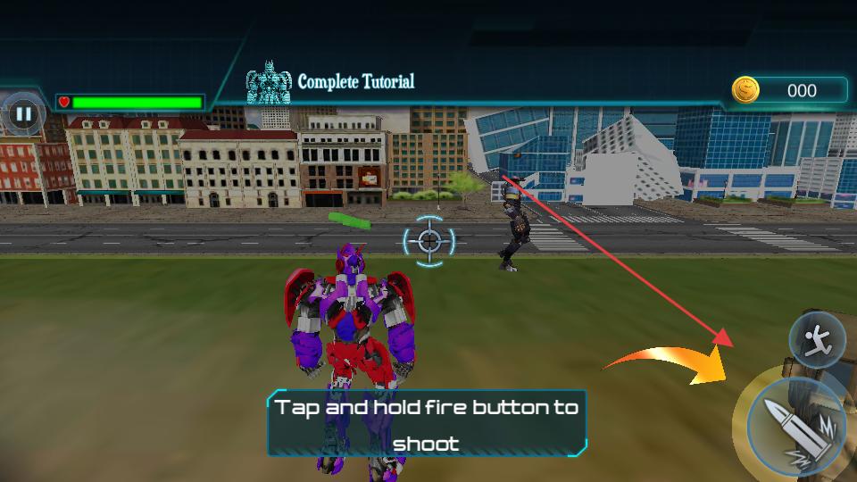 4、進入游戲場景,操控機器人,依據提示,點擊并按住射擊按鈕,瞄準敵方機器人,進行射擊,注意躲避敵人攻擊。