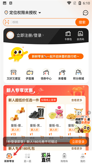 1、首頁有搜索欄,設又好又便宜、伊直播等功能入口,推新人專享優惠,展示多款新人價零食,底部有新鮮零食、逛一逛等功能欄。