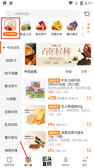 2、逛一逛板塊,有搜索欄,設為你推薦、新品上市等分類,展示今日必買商品如牛乳力純牛奶等,標注價格、銷量,底部有功能欄。