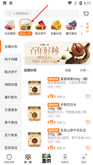 3、新品上市板塊,展示堅果炒貨類商品如夏威夷果、手剝巴旦木等,標注價格、銷量,方便用戶選購新品零食。
