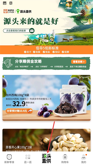 4、源頭直供板塊,推源頭直供商品,倡導5低新標準,展示加州西梅、原香開心果等,介紹分享賺傭金攻略,底部有功能欄。