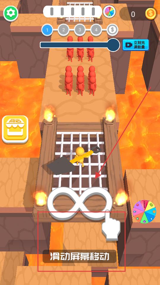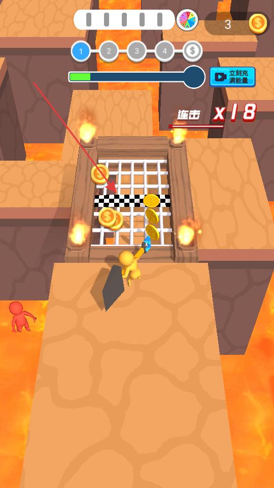 1、滑動屏幕操控小人移動,在帶有火焰的網格平臺上避開紅色小人,朝著前方區域前進,同時留意屏幕提示,熟悉移動操作方式。