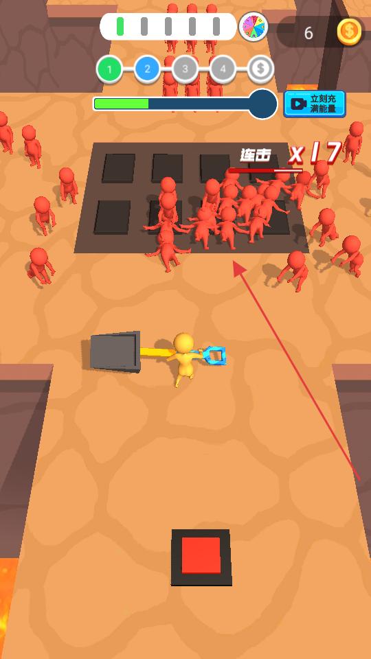 4、進入新關卡,面對大量紅色小人聚集的場景,操控小人移動,利用手中的道具,嘗試對紅色小人進行攻擊,繼續積累連擊次數,推進關卡進程。