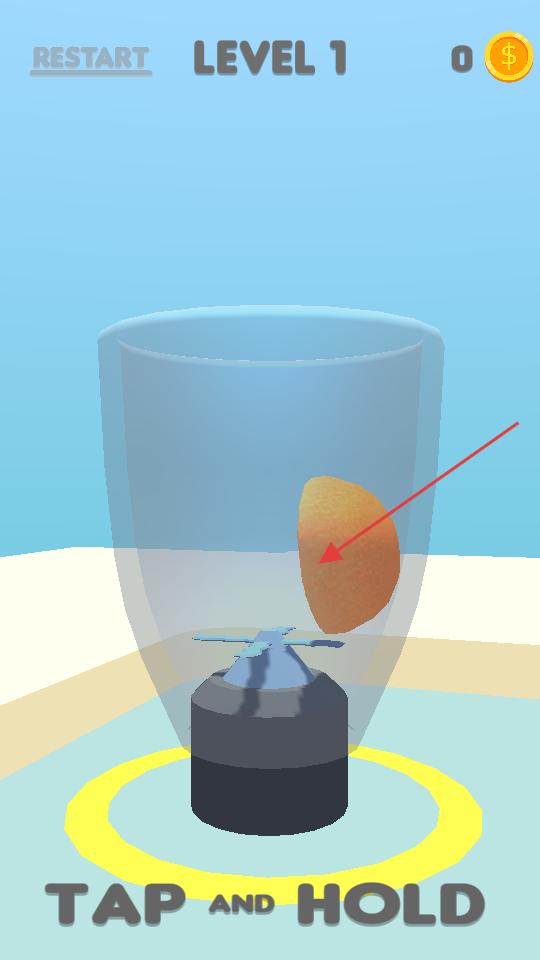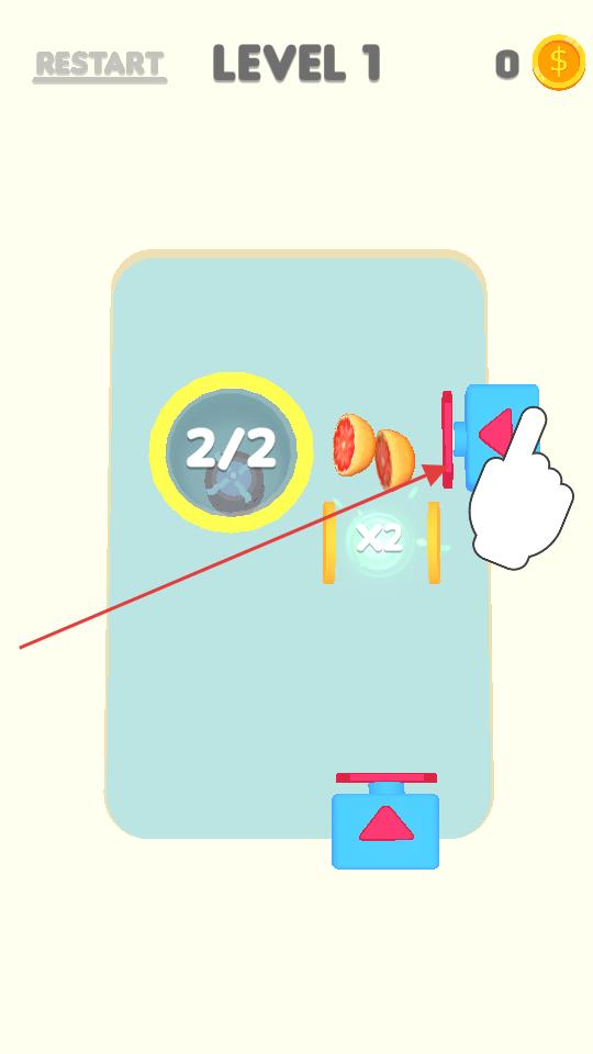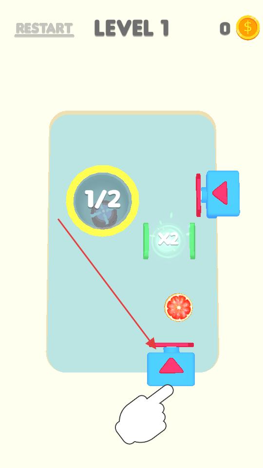 1、進入Level1,點擊下方帶三角形的藍色按鈕,觸發機關,使水果朝目標區域移動,此時界面顯示收集進度為1,推進果汁制作的準備步驟。