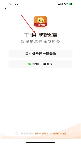 1、鴨題庫登錄頁,有小鴨圖標,提供本機號碼和微信一鍵登錄,需同意用戶協議和隱私政策,可享極致課程服務。