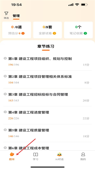2、題庫界面屬管理類,有章節練習,涵蓋多建設工程管理板塊,可看做題進度、預估分等,助力針對性刷題。