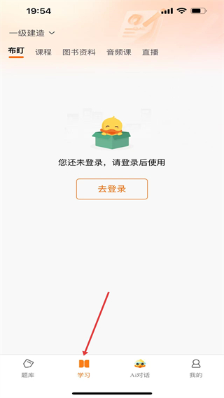 3、學習界面顯示一級建造分類,有布盯、課程等板塊,因未登錄提示登錄后使用,登錄可獲取學習資源。