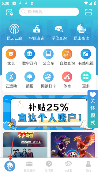 1、首頁,有昆藝云廊、學區查詢等功能入口,還有家長、數字政務府等服務分類,展示補貼活動及本地資訊內容。