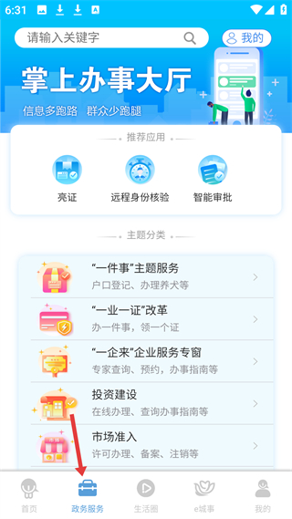 2、政務服務,即掌上辦事大廳,有亮證等推薦應用,還有一件事服務、一業一證改革等主題分類,提供多元政務服務。