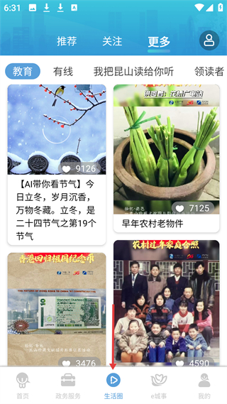 3、生活圈,有推薦、關注、更多板塊,涵蓋教育等分類,展示AI看節氣、農村老物件等本地資訊,可瀏覽互動。
