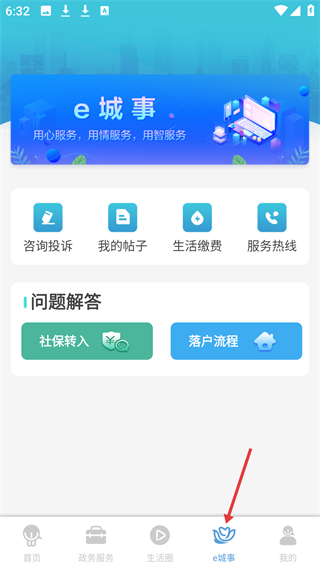 4、e城事,有咨詢投訴、生活繳費等功能,提供社保轉入、落戶流程等問題解答,為市民提供城市事務服務。
