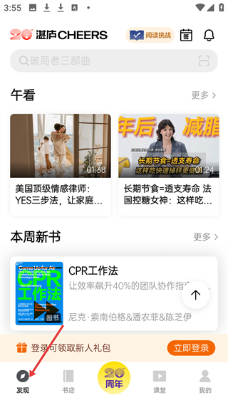 1、發現板塊,有搜索功能,設午看、本周新書板塊,午看推情感健康視頻,本周新書薦CPR工作法,提供閱讀視聽內容。