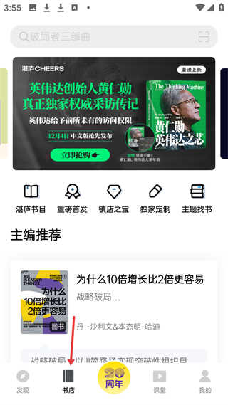 2、書店板塊,展湛廬書目等分類,主推黃仁勛傳記,主編薦為什么10倍增長比2倍更容易,是圖書選購平臺。