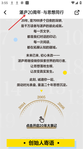3、20周年板塊,呈湛廬20周年與思想同行內容,回顧發展歷程,有大事記和創始人寄語,展現品牌文化積淀。