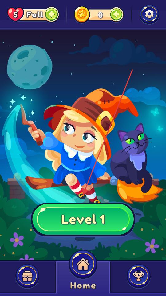 1、進入游戲主界面點擊綠色Level1按鈕,進入第一關場景,女巫站在石板區域,周圍有樹木、路燈和帶寶石的石頭,準備開始推石闖關。