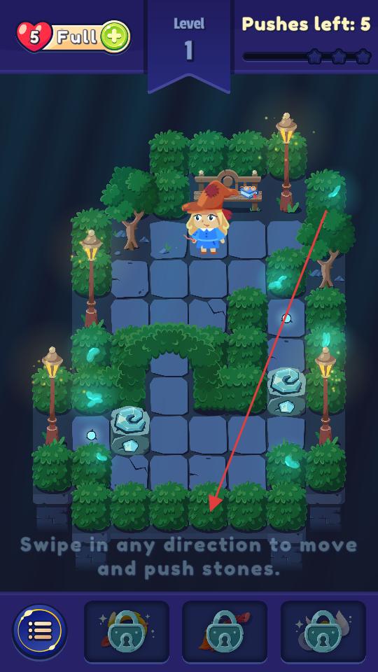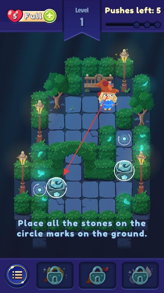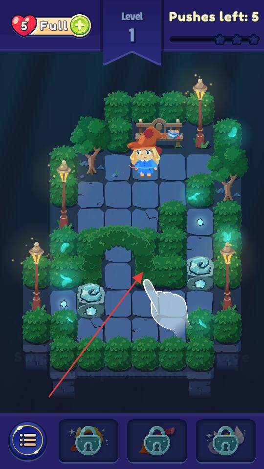 2、第一關場景根據提示滑動屏幕操控女巫移動方向,嘗試推動石頭,按照指引逐步移動女巫,靠近石頭。