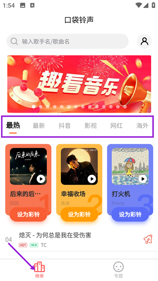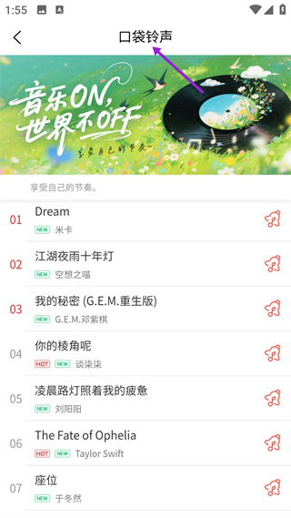 4、專題詳情頁展示對應專題下的鈴聲列表,標注新歌熱門標識,是查看專題內具體鈴聲的界面。