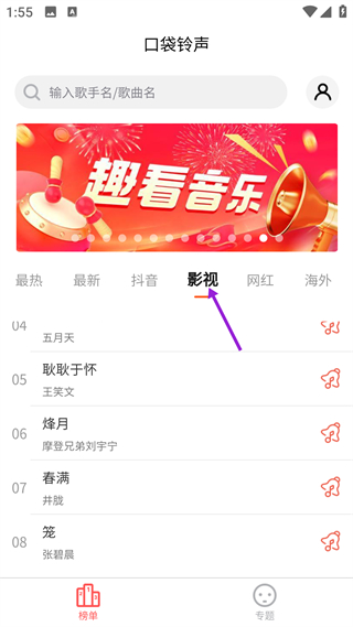 2、切換至影視分類頁,展示影視相關鈴聲列表,標注歌手信息,可快速篩選影視類鈴聲資源。