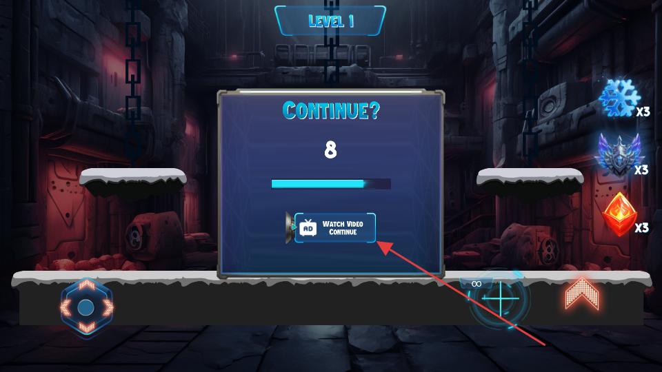 4、若戰斗失敗會彈出CONTINUE的提示框,此時可點擊相關按鈕,選擇繼續游戲的方式,重新投入戰斗,爭取在關卡中取得勝利。