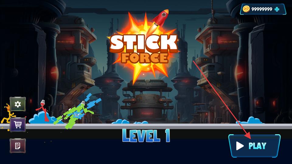 1、進入火柴人力量銀河游戲,點擊PLAY按鈕,進入帶有機械場景和火柴人角色的戰斗關卡,準備操控火柴人戰斗。