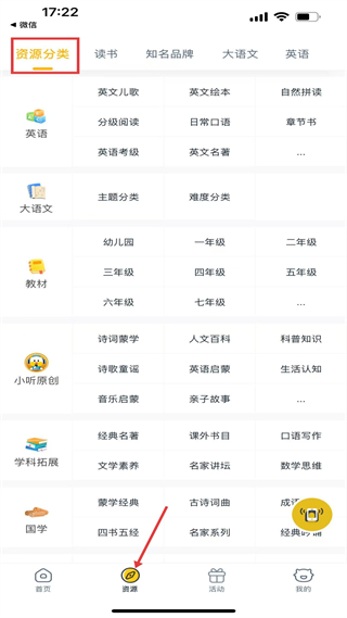 1、進入資源分類頁面,可見英語大語文等資源類別,每個類別下還有細分內容,可根據學習需求選擇對應分類,查找相關的學習資源內容。
