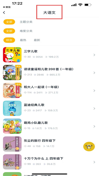 2、進入大語文分類頁面,展示了多款學習資源,涵蓋兒歌讀物等不同類型,適配不同學段,可瀏覽這些資源,挑選適合的內容進行學習。