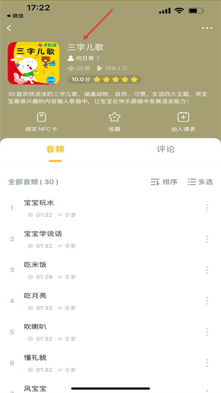 3、進入三字兒歌詳情頁,能看到該資源的評分及介紹,還有對應的音頻列表,可進行收藏或加入課表等操作,方便后續使用該學習資源。