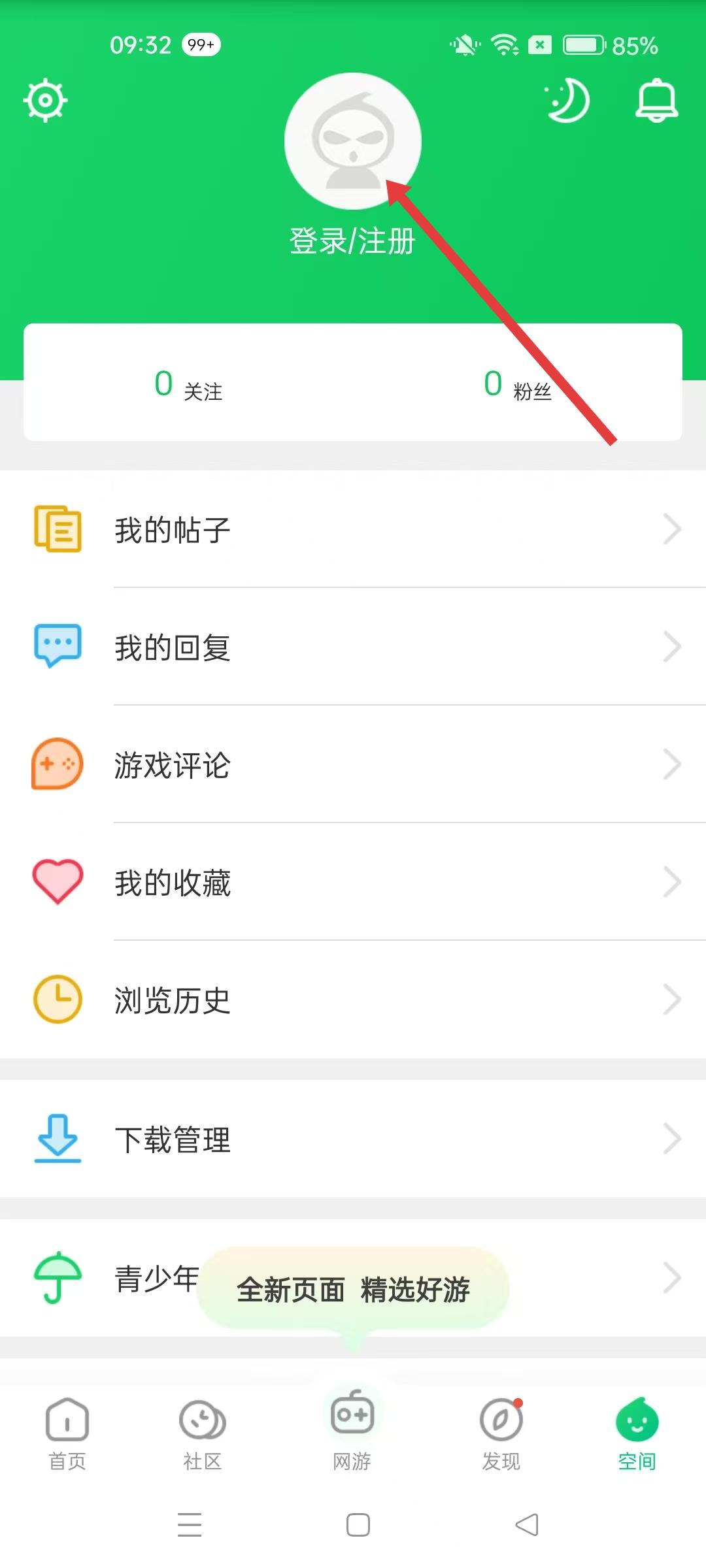 2、進入空間界面后,點擊登錄、注冊按鈕,可進入賬號登錄頁面,準備進行賬號登錄操作。
