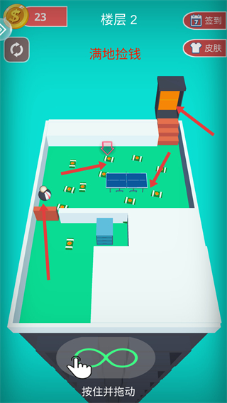 3、到樓層2,場景里滿地是錢,繼續按住并拖動,操控角色在樓層內移動,收集地上的錢,積累金幣數量。