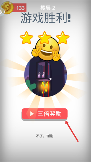 4、成功完成樓層2的任務后,會顯示游戲勝利,能看到星級評價,可選擇三倍獎勵獲取更多獎勵,或點擊不了。
