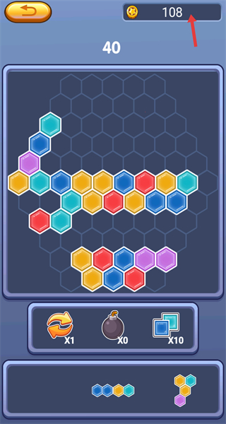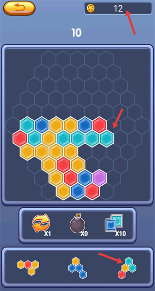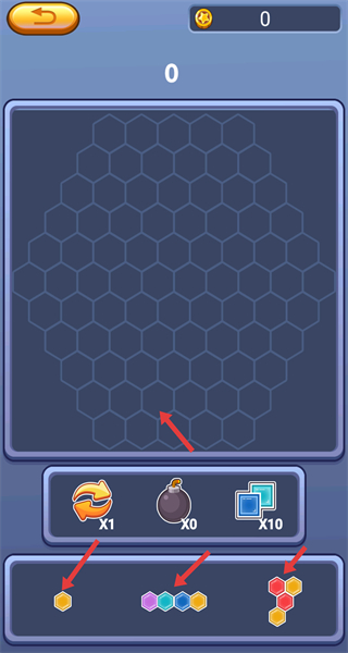 2、進入游戲后下方有不同形狀的六邊形方塊,需將它們拖動到上方六邊形網格的合適位置,進行拼接組合。