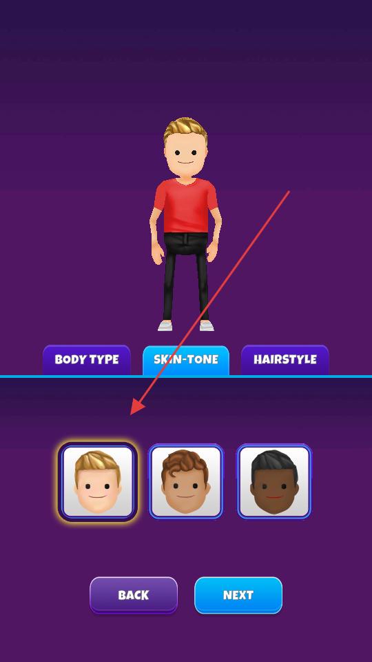 2、在皮膚色調設置區域,從提供的選項中挑選喜歡的皮膚顏色,能看到角色皮膚效果隨選擇變化,選好后點擊NEXT按鈕,進入發型設置部分。