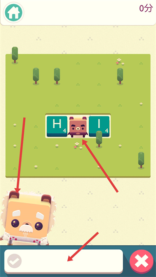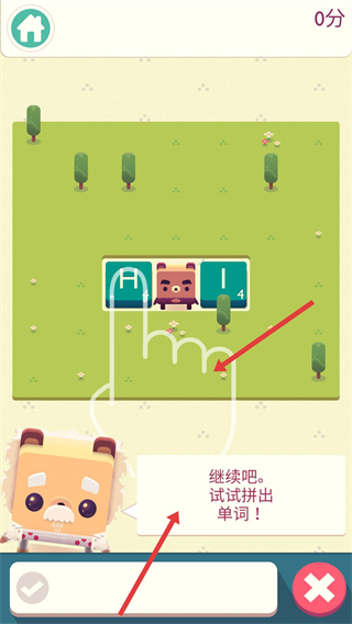 3、在綠色場景,方塊熊周圍有字母塊,根據提示,嘗試選擇字母,拼出正確的單詞,積累分數。
