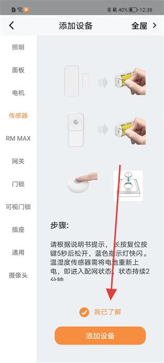 3、若選擇傳感器等設備按照說明書提示長按復位鍵5秒后松開,待藍色指示燈快閃且設備進入配網狀態后,勾選我已了解,點擊添加設備按鈕。