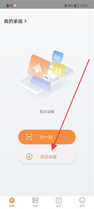 1、進入APP我的家庭頁面點擊添加設備按鈕,進入添加設備頁面,準備添加智能家居設備。